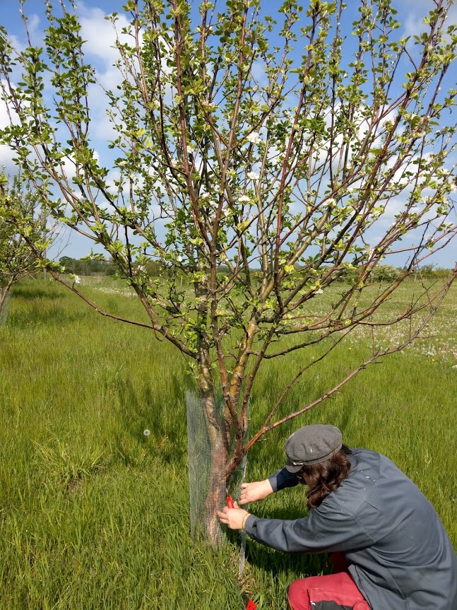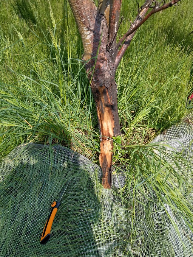 Da der ikke er faglig viden herhjemme om, hvordan man bedst redder brandskadede frugttræer, er vi tvunget til at tage beslutninger på basis af vores egne fornemmelser for, hvad der kan være den bedste hjælp. Vi kan se, at de værste skader på bark og ved er på sydsiden af træstammerne, derfor må solens stråler have en stor betydning. Sidste år fik vi med gode trævenners hjælp kalket stammerne, for at beskytte stammerne mod solskoldning og yderligere udtørring, og det har vi tænkt os at gentage i år. Vi har besluttet at “forbinde” stammerne med jutebånd og så efterfølgende kalke båndene. Forhåbentlig holder det bedre på kalken.