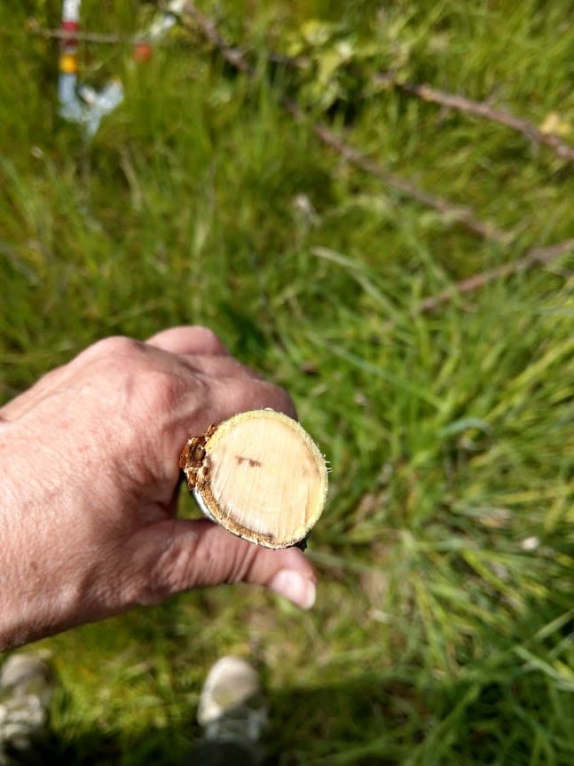 De nederste grene er så brandskadede, så her var ingen tvivl om, at de skulle fjernes. I snittet kan man (om det fremgår af foto) tydeligt se, hvordan bark og ved er tørt, på nogle helt ind til center af grenen. Jeg er heller ikke i tvivl om, at vi også bliver nødt til at fjerne al den frugt, der bliver dannet på de mest skadede træer.